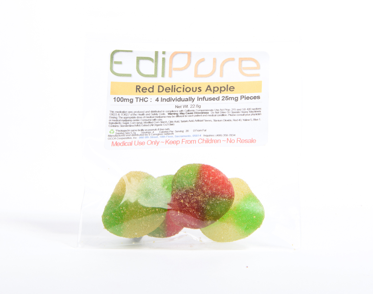 - Strength: 100 mg THC per bag, 25 mg THC per piece. Strong!