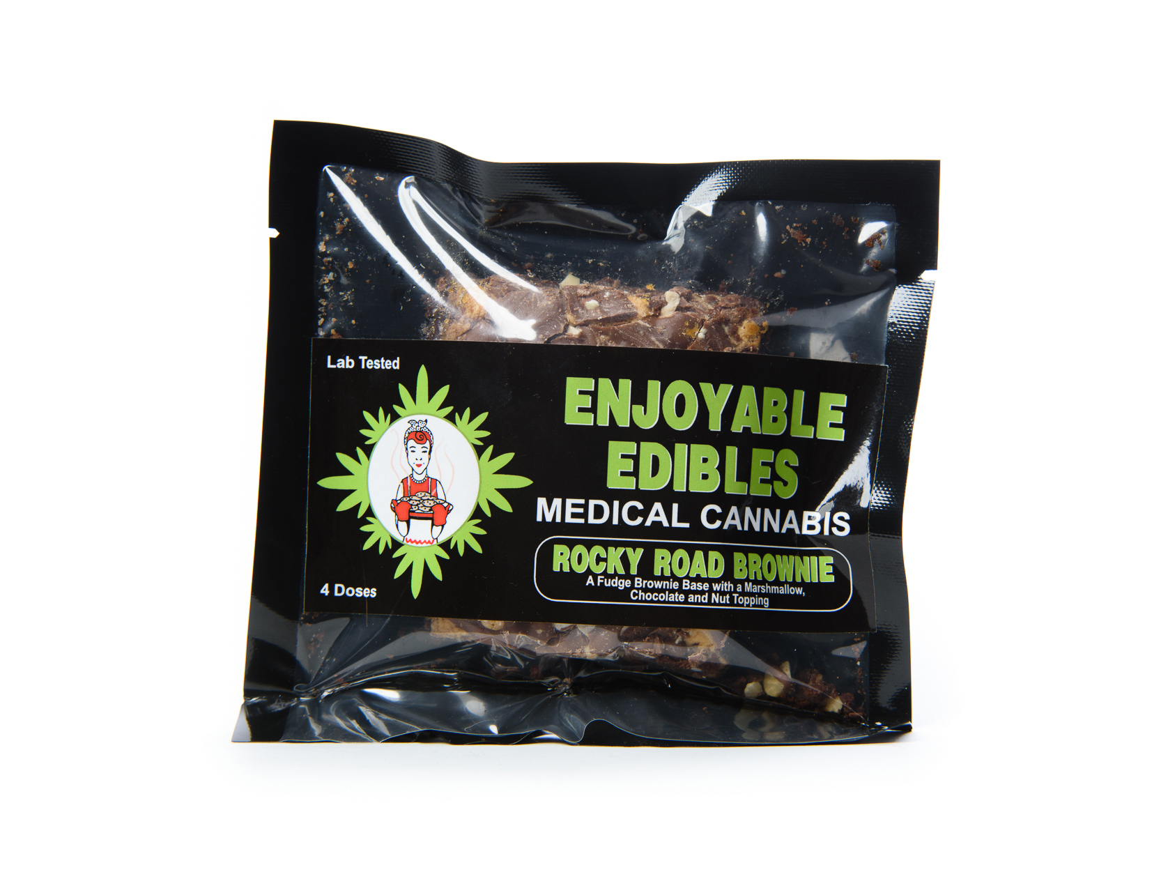 - Overall: We love this Rocky Road Brownie by Enjoyable Edibles! At 350 mg THC per brownie, this thing is STRONG! New users should use extreme caution when eating this brownie. Experienced users should start with a fourth of the brownie before eating any more. The high this brownie induces is a heavy relaxed high. The mix of flavors in this brownie is quite a treat! We love the mix of chocolate, marshmallow, and nuts. Give this brownie a try if you want to be heavily medicated!