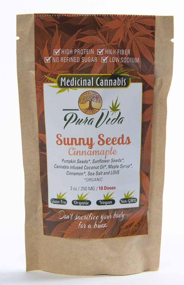 - Overall: We are OBSESSED with Sunny Seeds by Pura Vida because this edible has it ALL! The current edible market is full of sugary treats which is why Pura Vida edibles stand out. This edible is healthy, high protein, high fiber, low sodium, and contains no refined sugar. The cinnamon and maple flavors mix so well with the cannabis infused coconut oil. The minimal weed taste makes this edible so easy to consume but be careful, as this edible is potent! The whole bag contains 250 mg THC which will surprise you given the epic taste. New users may want to start with a small handful of seeds, while experienced users may want half the bag to a full bag. We felt heavily medicated from 1/4 the bag so consume wisely!
