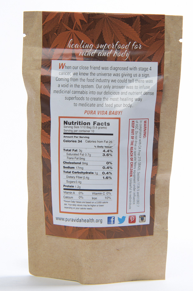 - Packaging: Pura Vida has some of the best packaging we have ever seen! The front of the resealable and eco-friendly bag proudly proclaims this edible is gluten free, organic, non-gmo, and vegan. The label states the 3 oz bag is 250 mg and is 10 doses. Most edible companies don’t provide both mg count AND recommended dose, so we love that Pura Vida does! On the back of the bag is a sweet company message alongside nutritional information.