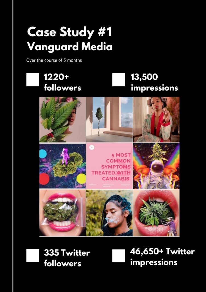 Vanguard Media Magazine, a women focused cannabis lifestyle outlet, came to Alice to help launch their social media accounts. Over the course of three months, Alice grew their Instagram following by 1220 accounts, the Instagram account received 13,500 impressions, the Twitter account grew by 335 followers and received 46,650 impressions during that time.