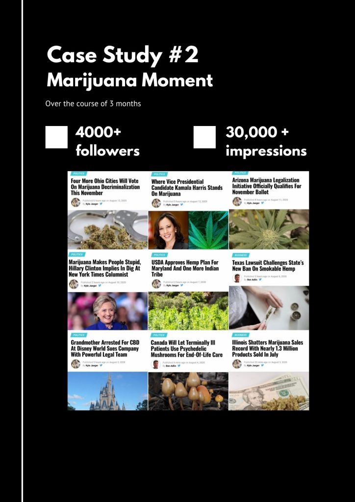 Cannabis news site Marijuana Moment had Alice curate and manage their Instagram feed over the course of 3 months. During that time, she grew their follower count by over 4,000 followers and the account received 30,000 impressions.
